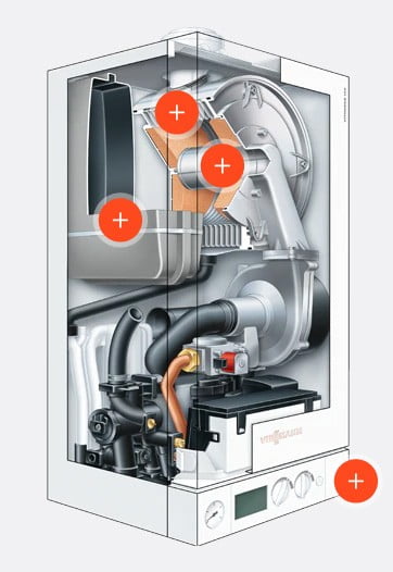 Datorită unităţii hidraulice AquaBloc – prevăzută cu sistemul multi-conector – toate componentele relevante pot fi accesate şi înlocuite cu uşurinţă prin partea frontală a cazanului.